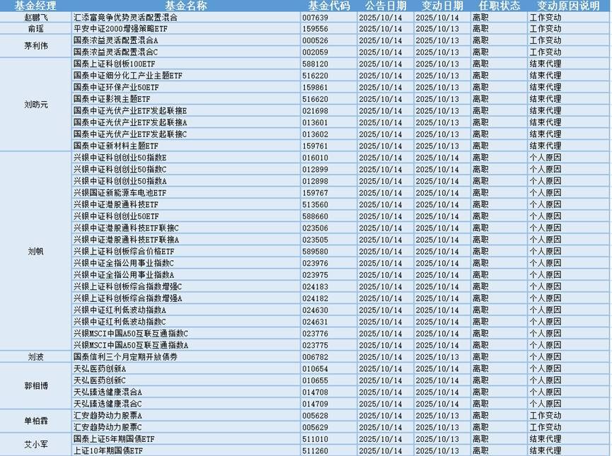 根据巨灵统计的数据显示,近30天(9.15-10.14)共有423只基金产品的基金经理发生离职变动。其中今天(10.14)有38只基金产品发布基金经理离职公告,从变动原因上来看,有4位基金经理是由于工作变动而从管理的6只基金产品中离职。有2位基金经理是由于结束代理而从管理的10只基金产品中离职。有3位基金经理是由于个人原因而从管理的22只基金产品中离职。