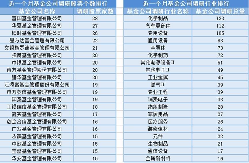 近一个月(9月15日-10月14日),富国基金参与公司调研的数量最多,共调研28家上市公司,然后调研较为活跃的还有华夏基金、博时基金和易方达基金,分别调研27家、26家、22家上市公司;从调研行业上来看,基金公司对化学制品行业的上市公司调研次数最多,共有123次,其次是汽车零部件行业,基金公司调研了112次。