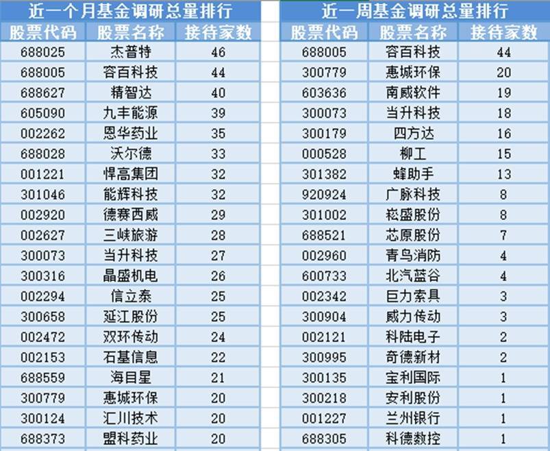 将时间周期缩短到最近一周(10月7日-10月14日)来看,基金调研数量第一的公司容百科技,属于正极材料行业,主营业务为多元材料、磷酸锰铁锂材料、钠电材料及多元前驱体的研发、生产和销售。共被44家基金机构调研,然后被调研数量较多的股票是惠城环保、南威软件和当升科技,分别接受20家、19家和18家基金机构的调研。