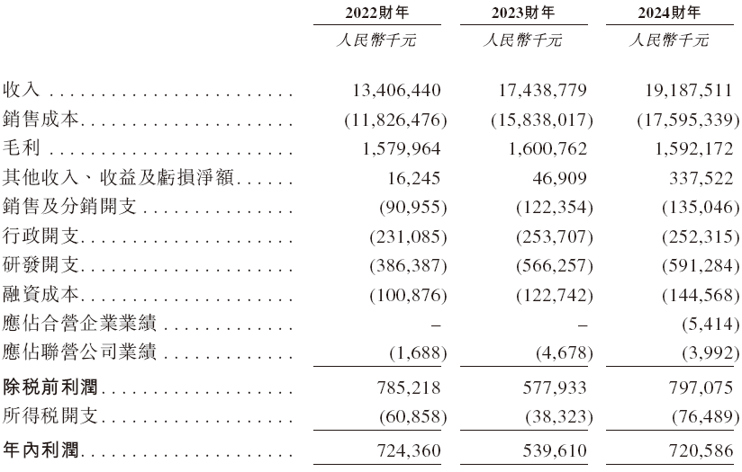 招股书显示,在过去的2022年、2023年和2024年,国恩股份的营业收入分别为人民币134.06亿、174.39亿和191.88亿元,相应的净利润分别为7.24亿、5.40亿和7.21亿元。